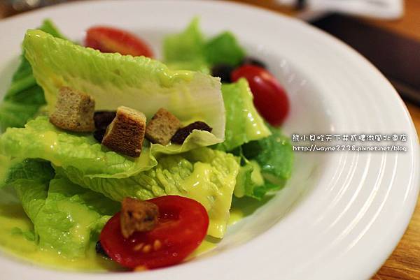副餐有沙拉一份、續杯飲料一杯、手作麵包一份(可續)